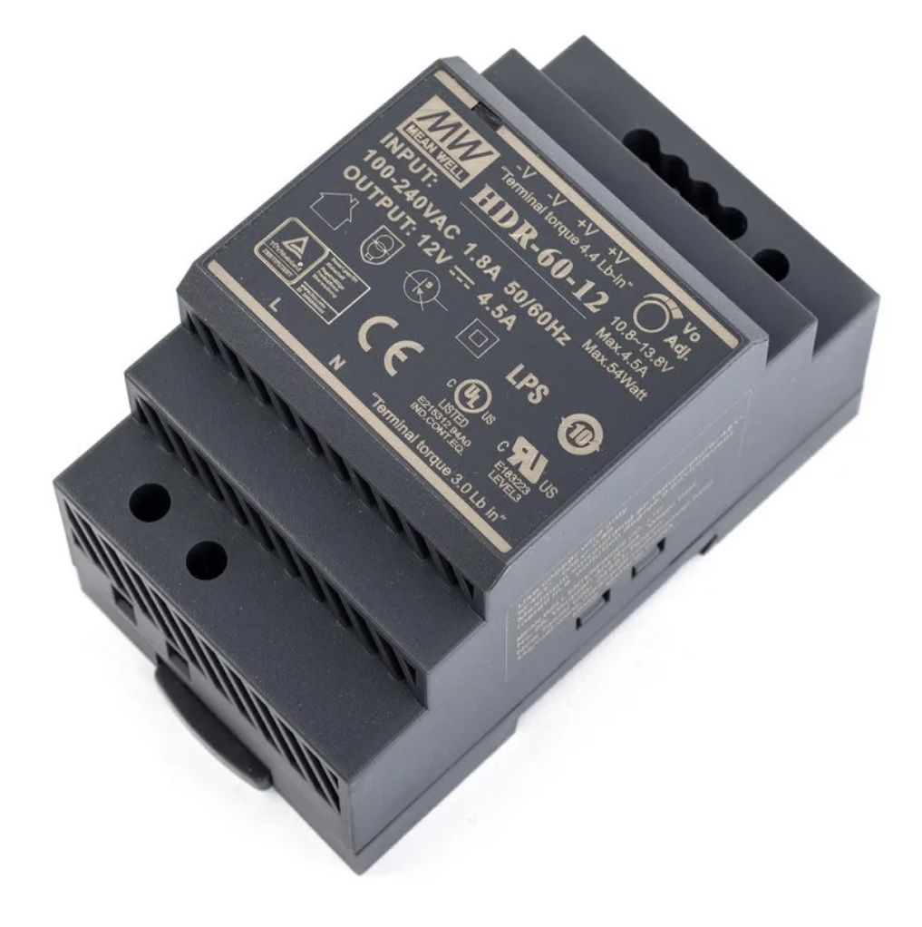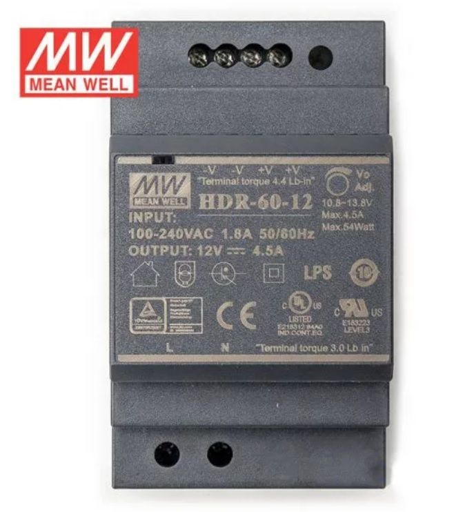 Компактный источник питания 12В на DIN-рейку MeanWell HDR-60-12, обладает II классом защиты от поражения электрическим током, имеют защиту от короткого замыкания, перегрузки, перенапряжения.