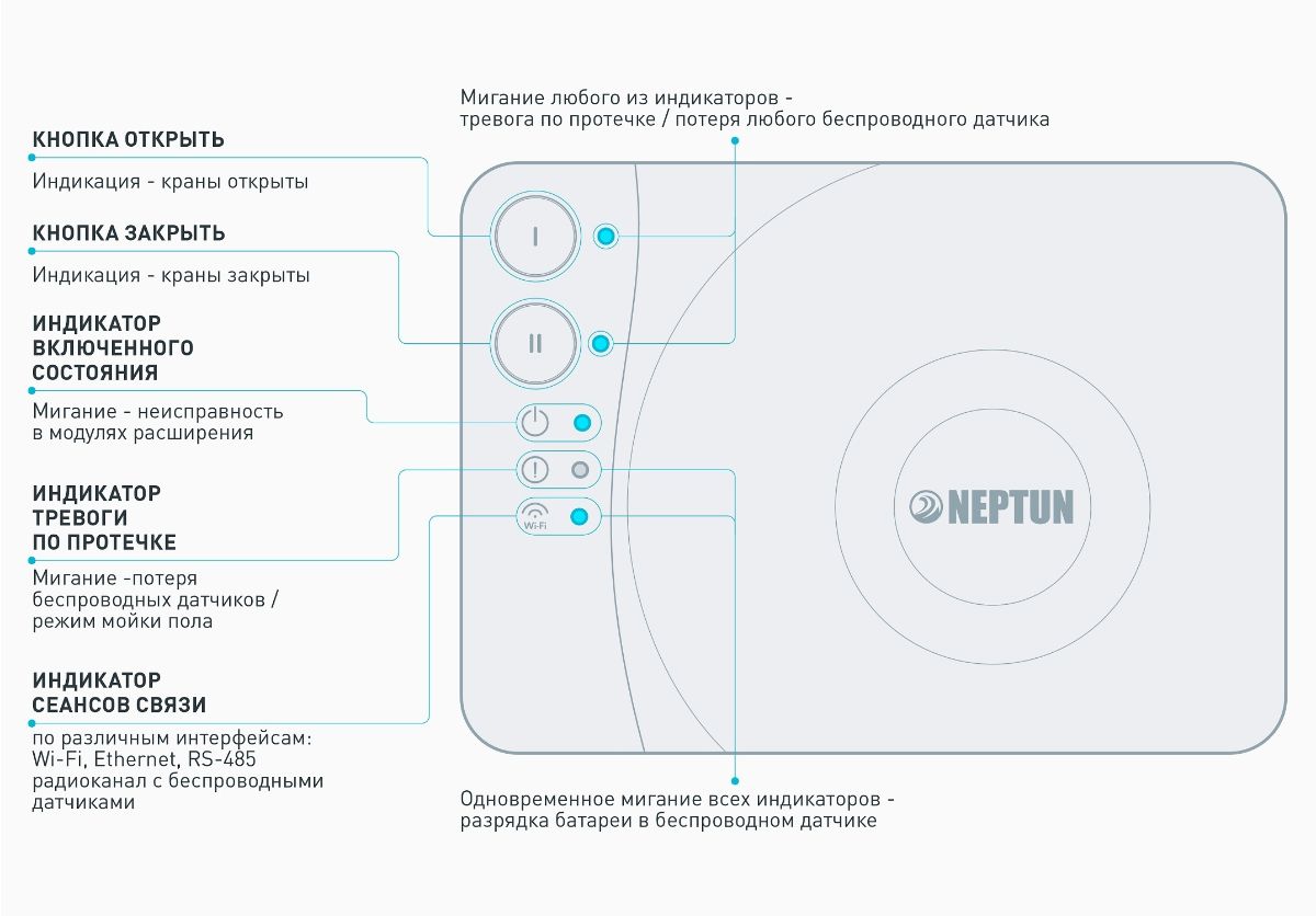 - если Вы устанавливаете модуль управления Neptun в сантехнический шкаф и доступ к нему очень проблематичен, то рекомендуем Вам приобрести внешнюю мастер-кнопку, которая позволит снимать аварию с модуля управления без доступа к устройству: https://neptunsale.ru/products/knopka-neptun