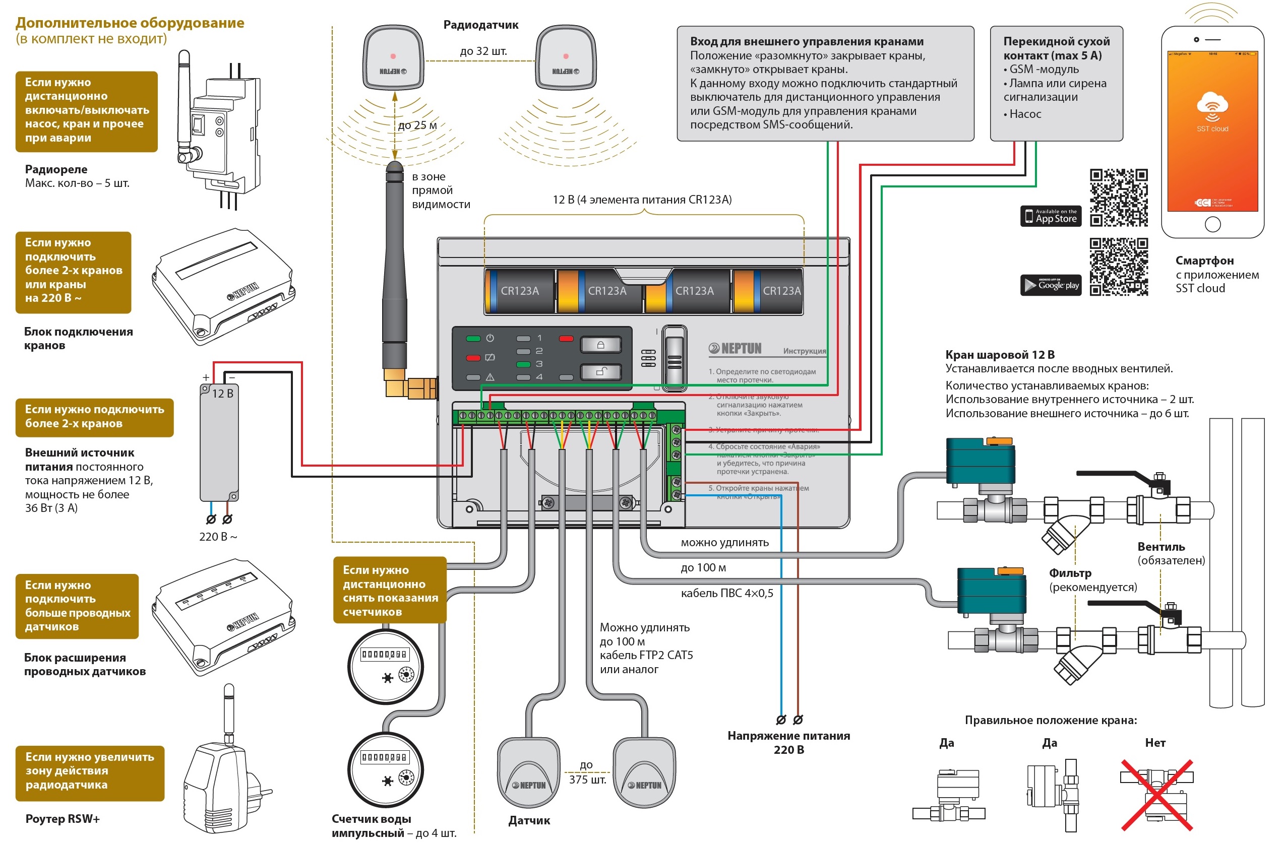 Комплектация системы контроля протечки воды Нептун с самым современным модулем управления Neptun Prow+ Wi-Fi и шаровыми кранами из нержавеющей стали Neptun Profi.