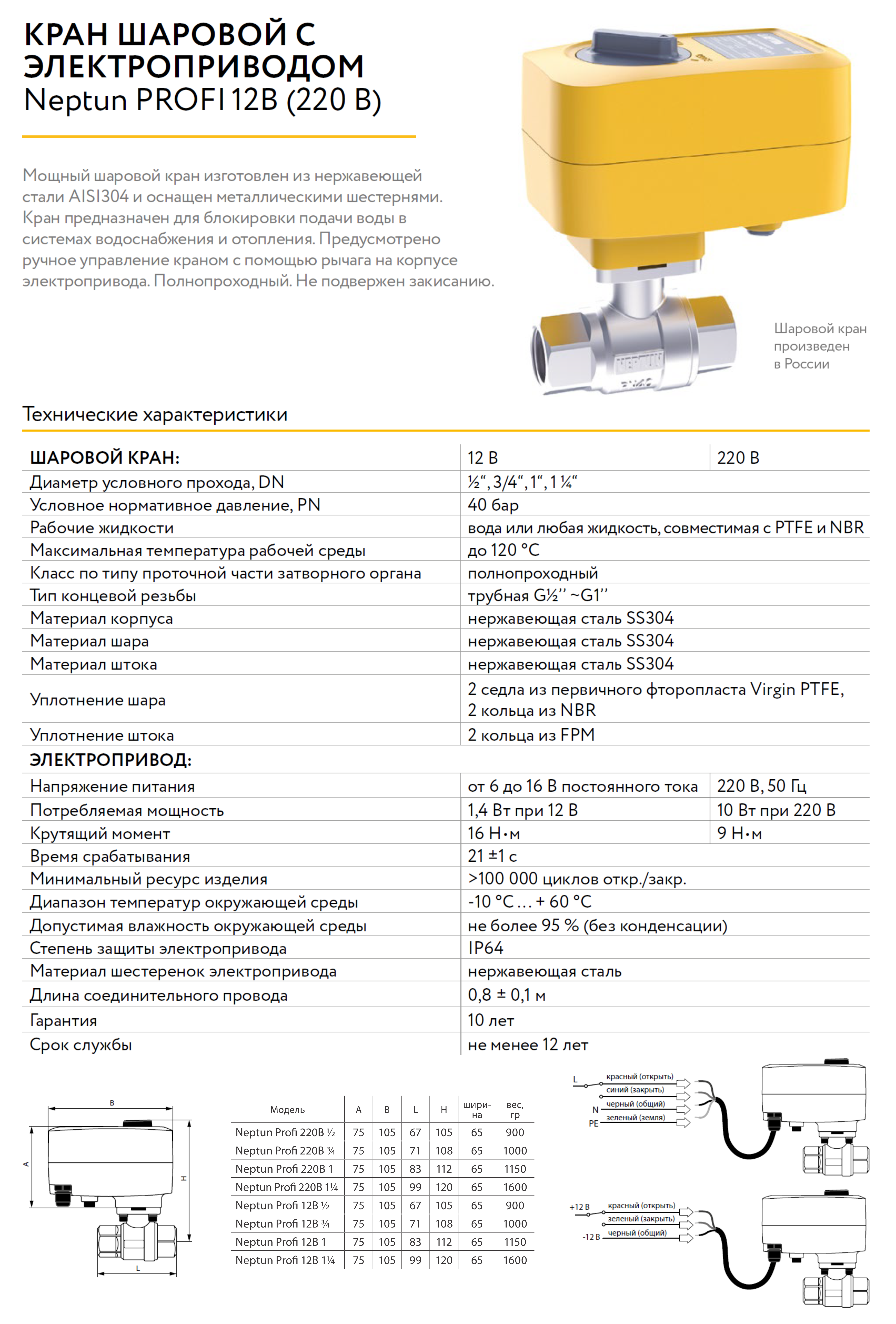 Мощный шаровый кран с электроприводом серии Neptun Profi изготовлен из нержавеющей стали AISI304 и оснащен металлическими шестернями. Кран предназначен для блокировки подачи воды в системах водоснабжения и отопления. Предусмотрено ручное управление краном с помощью рычага на корпусе электропривода.