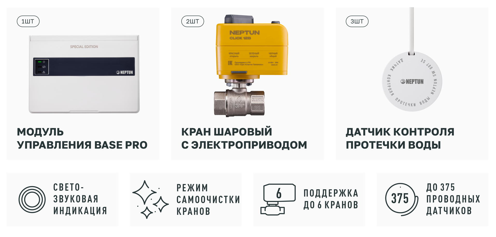 В этот комплект добавлен умный модуль передачи показаний счетчиков воды, который расширяет функциональность системы NEPTUN BASE PRO.
